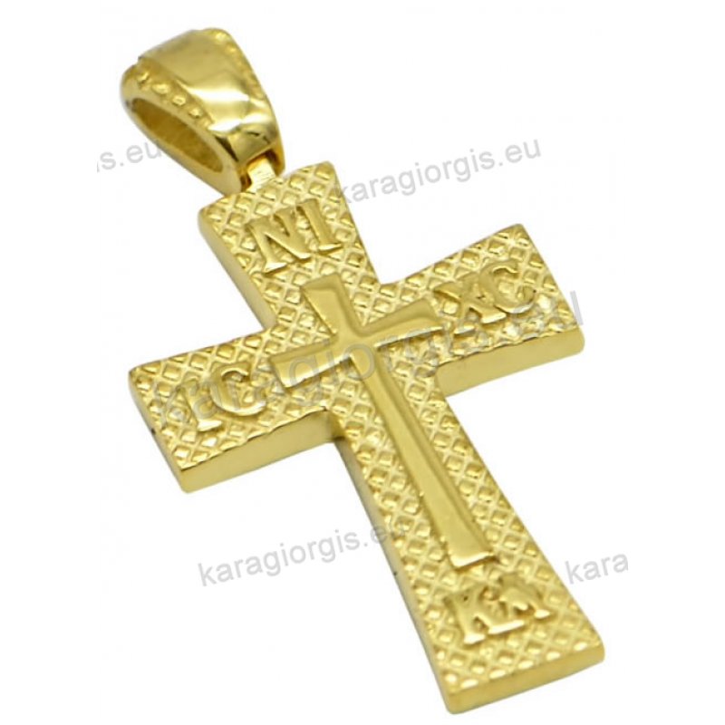 Βυζαντινός σταυρός διπλής όψης γυναικείος χρυσός ή βάπτισης σε Κ14 με άσπρη και πράσινες πέτρες ζιργκόν με ανάγλυφο στην πίσω πλευρά IC.XC.NI.KA. T979KP