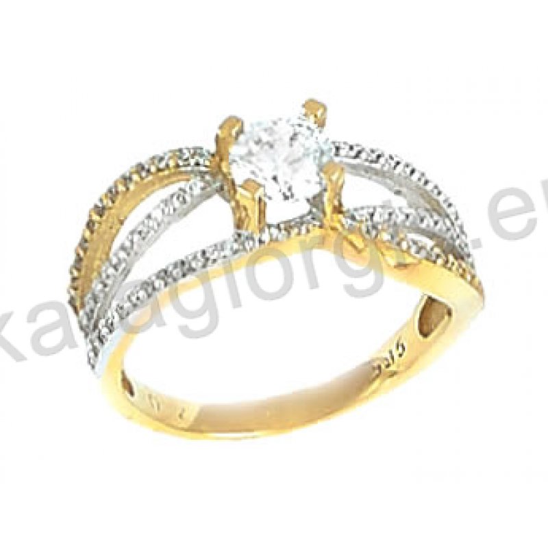 Μονόπετρο δίχρωμο δαχτυλίδι Κ14 λευκόχρυσο με χρυσό σε τριπλό με πέτρες ζιργκόν. DH326